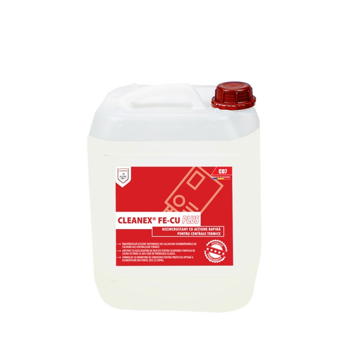CLEANEX Fe-Cu PLUS este o soluţie acidă cu actiune rapida, destinată curăţării depunerilor de calcar ( piatra) din schimbatoarele de căldură ale centralelor termice şi de pe elementele colmatate din instalaţie.