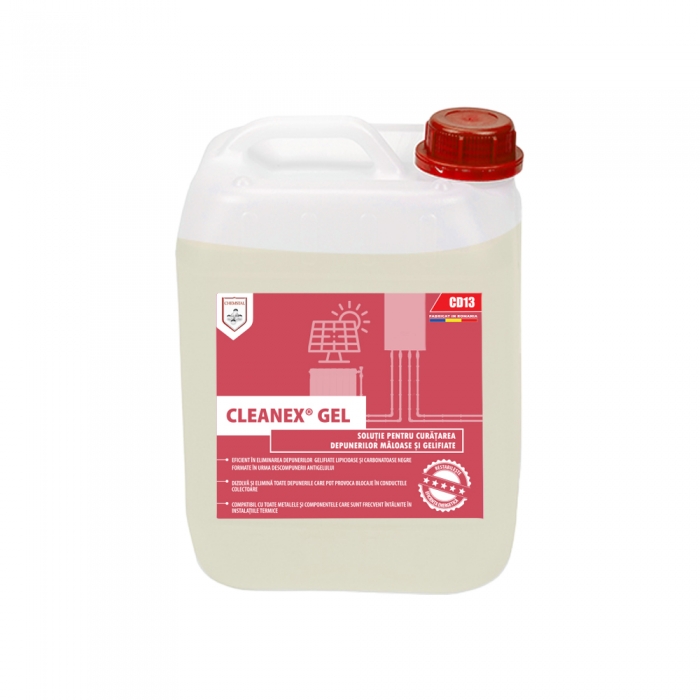 CLEANEX GEL este un dezincrustant cu conţinut de solvent eficient în eliminarea depunerilor gelifiante lipicioase (gume) şi carbonatoase negre, formate în urma descompunerii antigelului dar şi a depunerilor mâloase şi calcaroase ce apar în instalaţiile termice. Produsul dizolvă şi elimină toate depunerile care pot provoca blocaje în conductele colectoare.